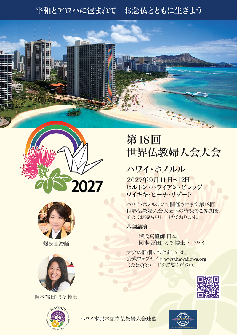 大会の目的は、阿弥陀如来の無限の慈悲と、感謝・つながり・平和の表現としての念仏をともに味わい、浄土真宗の理解と生活をさらに深めることです。学びを共有し、友情を育み、アロハの精神と共に、すべての存在との一体感を受け入れ、日常生活において平和の心を養うことを目指します。